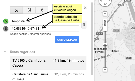 Si tens dubtes de com arribar-hi fes clic a la imatge següent i accediràs a google maps per a calcular i veure la ruta. Tingues en compte que al mapa d'exemple la ruta calculada és sortint des d'Amposta. Només cal que escriguis el teu punt d'origen a l'apartat "A" i fes clic al "COM S'HI VA" o "CÓMO LLEGAR" (depenent del vostre navegador).